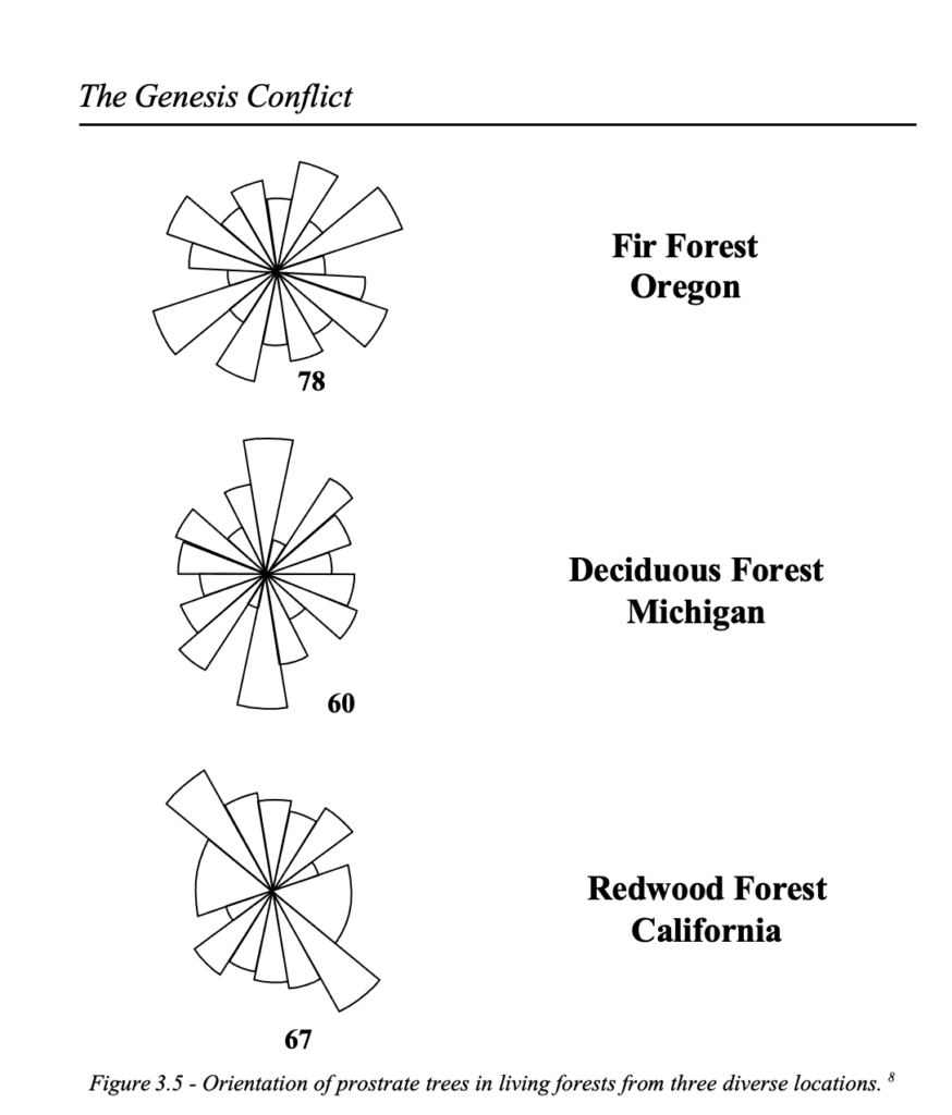 The organic layers, which previously were considered to represent the compacted forest floors, are also water sorted, which belies a mere forest situation. Analyses of tree orientation show that both horizontal and vertical trees are orientated in distinct directions. By comparison, the orientation of fallen trees in standing forests in Oregon, deciduous forests in Michigan and redwood forests in California show a lack of orientation (figures 3.4 and 3.5).