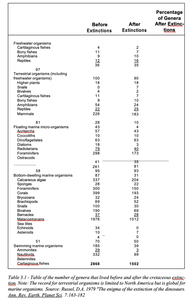 A catastrophe of this magnitude must surely have left its mark in the stratigraphic record. Indeed, the later cretaceous is as- sociated with huge scale extinction of numerous species including the dinosaurs. An analysis of the genera that survived this great extinc- tion at the end of the cretaceous shows that, besides the complete extinction of the dinosaurs, more than 50% of marine organisms also died in the destruction. In fact, the post cretaceous world is a shadow of what it was prior to this time period. The ammonites and belemnites suffered complete destruction, of all the swimming reptiles, only three survived. In fact, only 30% of all swimming marine organisms survived, whereas the survival rate of the fresh- water organisms (97% survival) was much higher (see Table 3.1)
